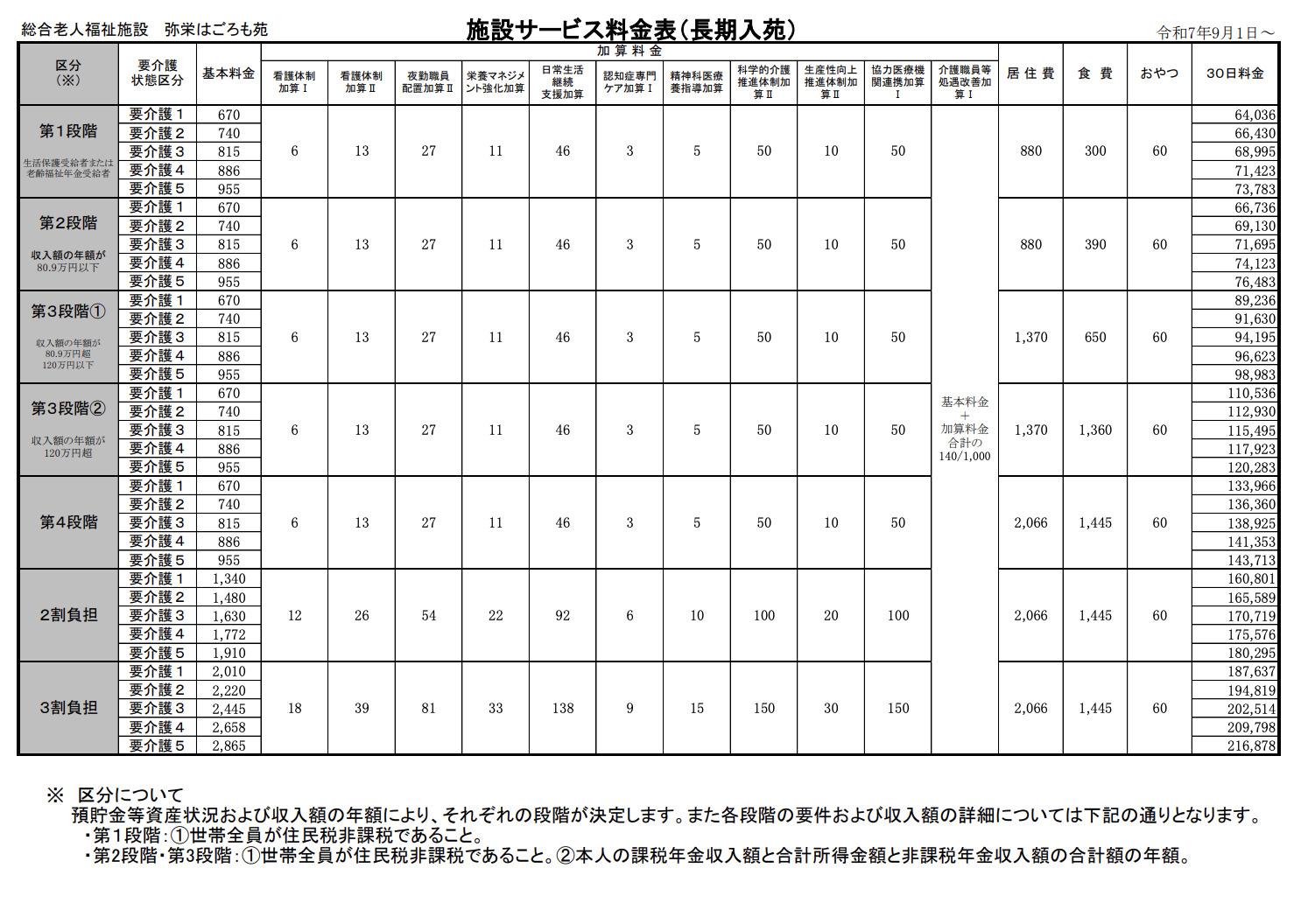 | 弥栄はごろも苑 | 施設サービス料金表(長期入苑) | 令和7年9月1日現在 | |||