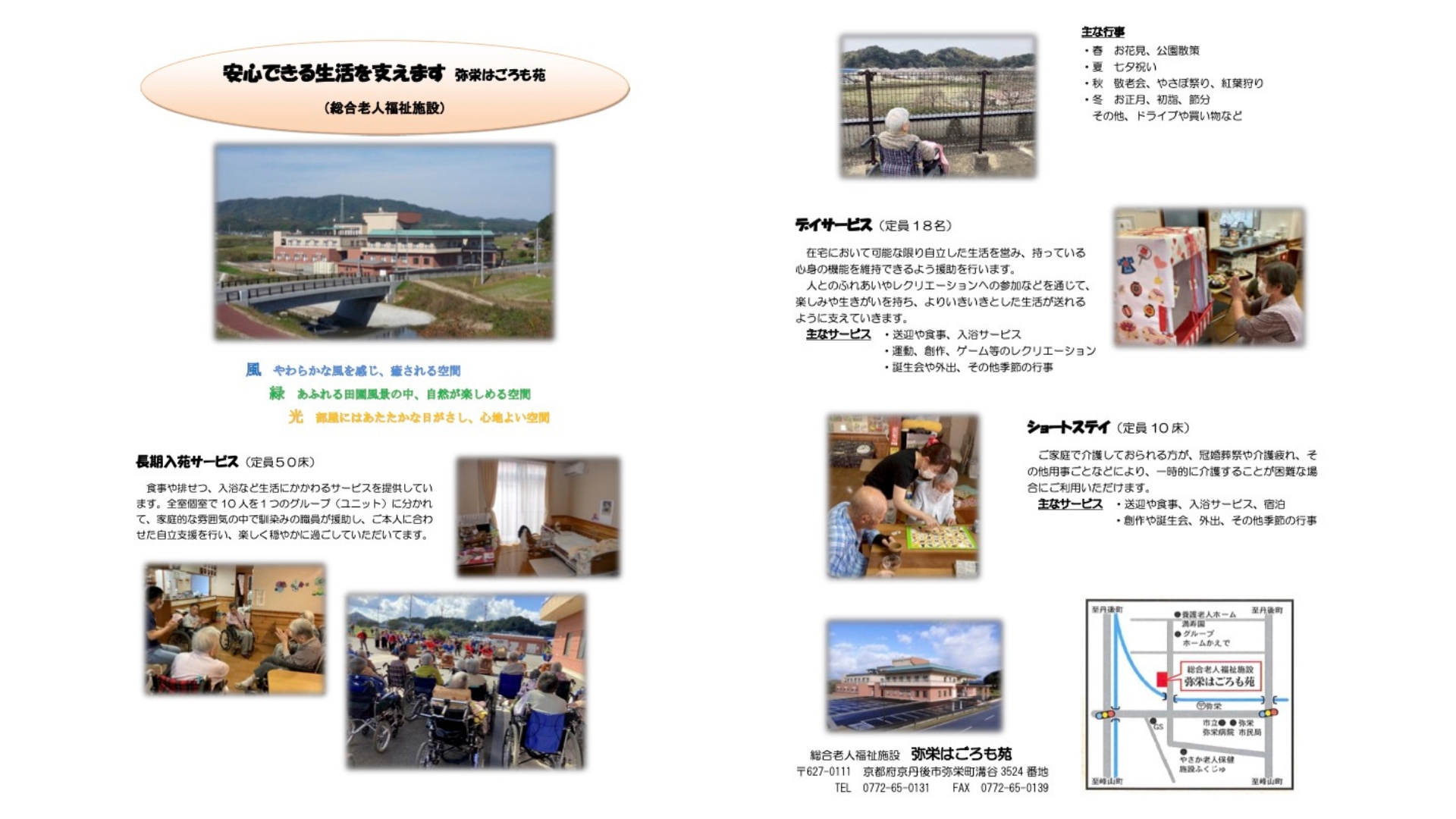 京丹後市弥栄町の中心地に位置し、近くには弥栄病院、弥栄市民局などがあります。 長期入所50人(全室個室、1グループ10人)、ショートステイ10人、デイサービス18人などの福祉サービスを提供しています。それぞれ、家庭での生活に基づいたサービスが提供できるように「想いを形に」を基本方針として、個人を尊重したケアを心がけています。 介護に関するご相談をはじめ、ケアプラン・ショートステイ・デイサービスのご利用について、お気軽にお問い合わせください。 |